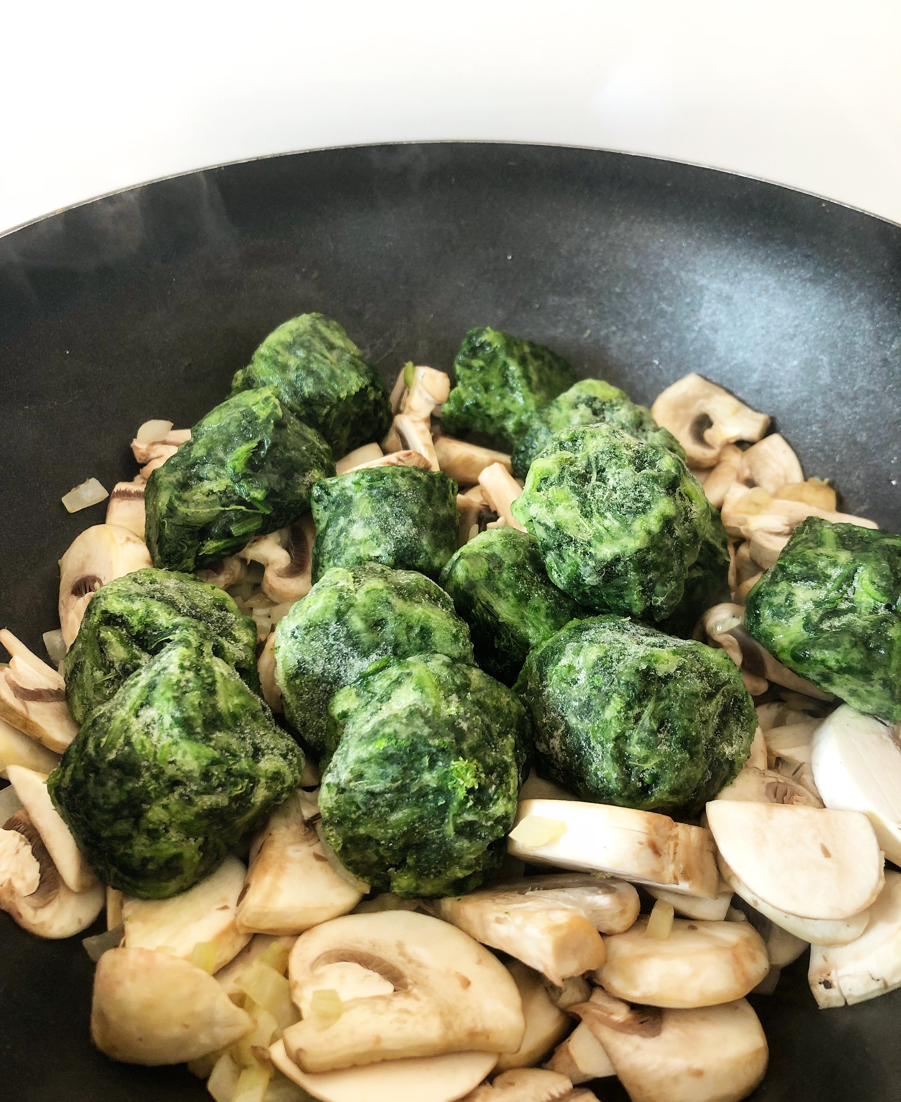 • Pendant ce temps-là, faites revenir l’oignon émincé et les champignons coupés dans un wok.