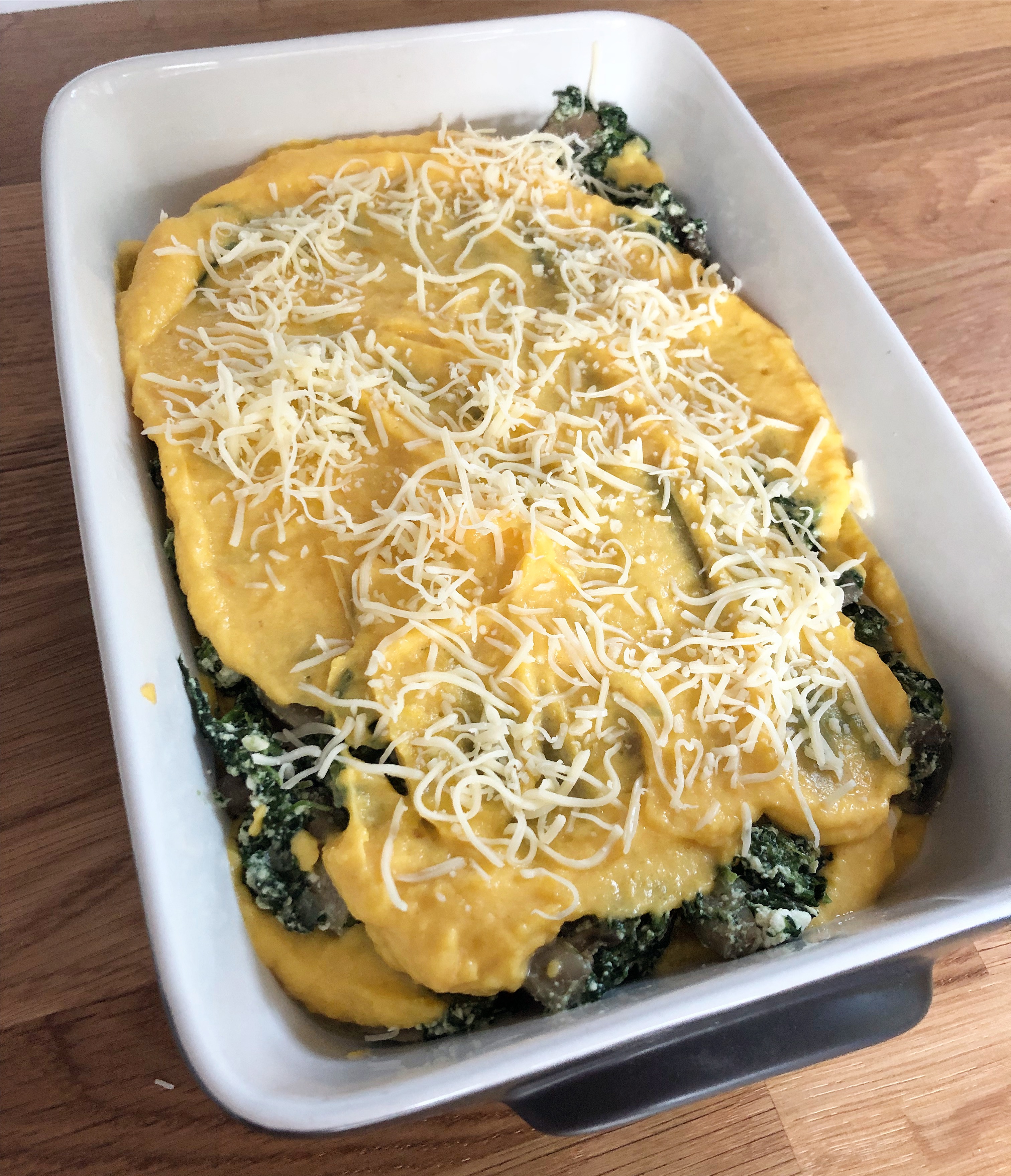 • Dans un plat, alternez les feuilles de lasagne avec la purée de butternut et les épinards, dans l’ordre qui vous plait le plus.